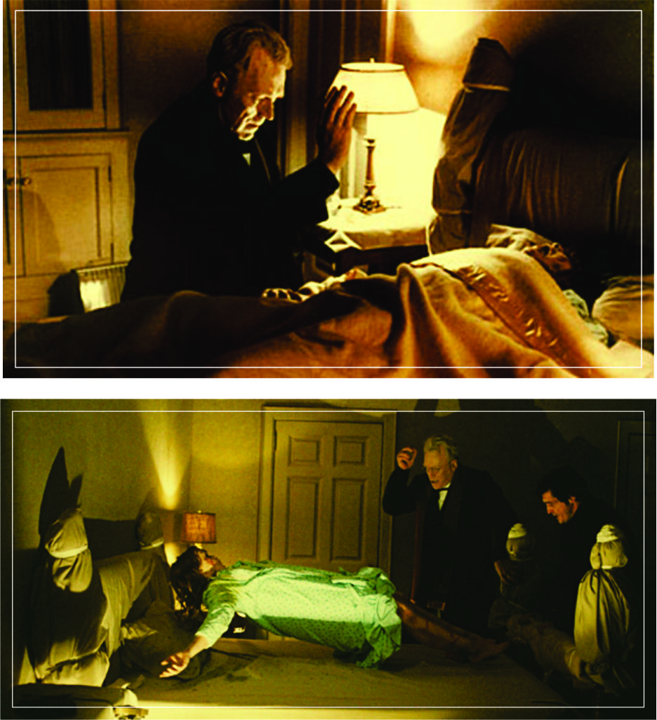 Los dos sacerdotes, fieles guerreros preparándose para la batalla con el enemigo; el padre Damien Karras joven e inexperto, con una tremenda duda de Fe en su interior y con un sentimiento de culpa al abandonar a su madre, indudable la presa fácil para el diablo, la debilidad en persona, y el padre Lankester Merrin, arqueólogo que ha tenido varios encuentros con el enemigo lo conoce bien, viejo lobo de mar, sabe las tretas que le pondrá; su edad es su debilidad.
