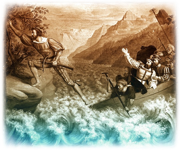 Durante su traslado a la fortaleza de Kustnach para ser encarcelado bajo la amenaza de ser desollado vivo; se embarcaron los custodios incluido el gobernador para atravesar el lago de los cuatro cantones cerca de las montañas de Rigi y Pilatus en los Alpes; donde debido a eso soplan vientos fríos, por lo que inesperadamente una violenta tormenta se desató sobre la cálida superficie del lago generando olas hasta de nueve metros. Cegados por el torrencial aguacero cundido de relámpagos; el inexperto improvisado capitán que apenas meses atrás aprendió a navegar perdió el control y la orientación, no sabía hacia dónde apuntaba la proa, por lo que estuvo a punto de chocar contra un escarpado cúmulo rocoso; mientras Gessler le gritaba y lo maldecía dando azotes a los remeros, hasta que una voz exclamó ¡yo sé dónde estamos!; al extremo del cúmulo hay un embarcadero natural de aguas profundas pero las rocas están lo suficientemente bajas para desembarcar mientras pasa la tormenta; explicaba Guillermo. Así que Gessler desconfiado, pero sin otra mejor opción para salvar su propia vida, ordenó con un ademán a los soldados que le quitaran los grilletes de las muñecas y tobillos.