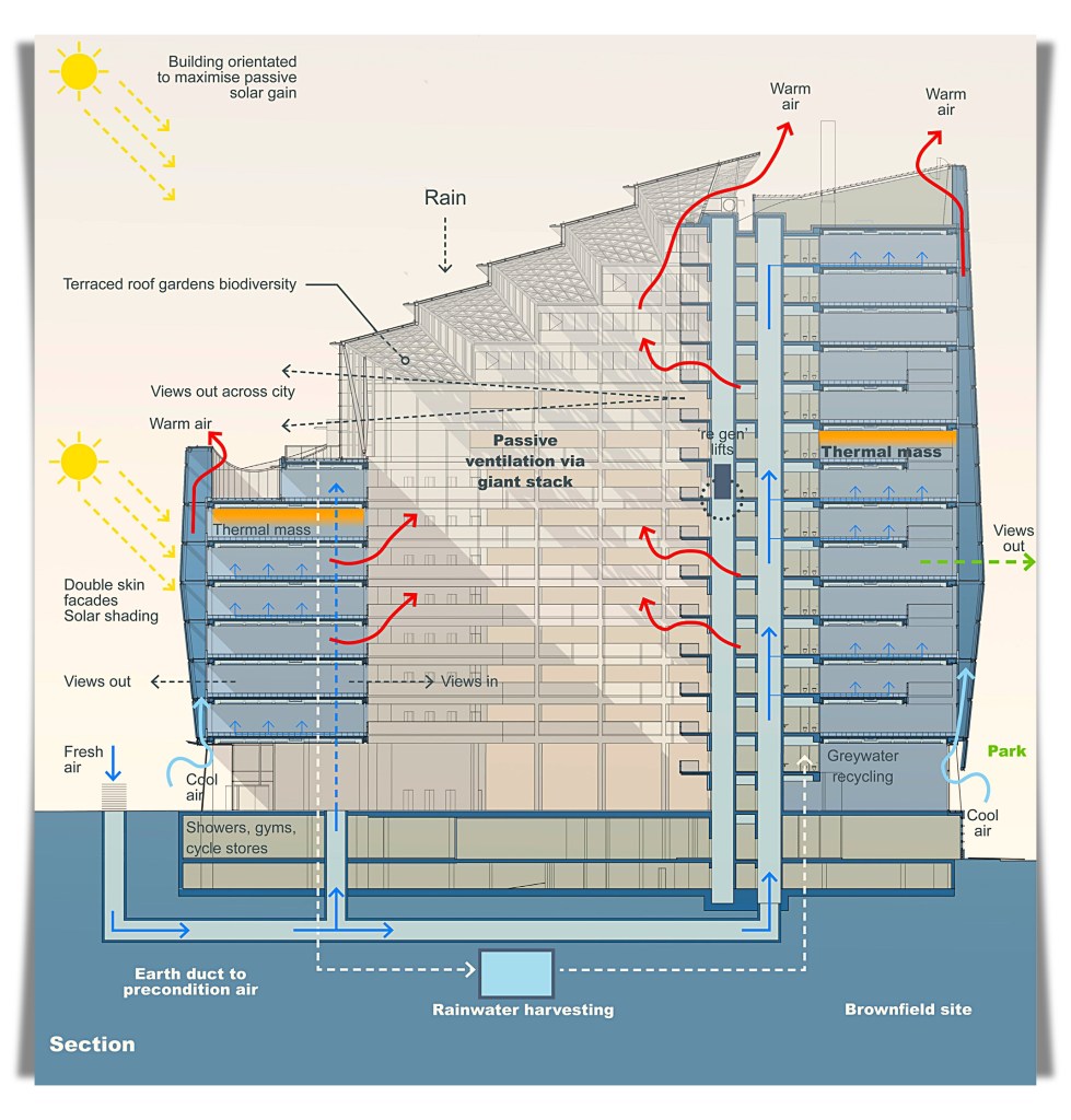 • Tiene un sistema de ventilación y enfriamiento adaptable a los cambios climáticos, que no requiere de bandas extractoras, ni aire acondicionado o calefactores que gasten mucha energía; funciona mediante tubos subterráneos de hormigón que actúan como una esponja térmica absorbiendo el calor; entre otras innovaciones técnicas.