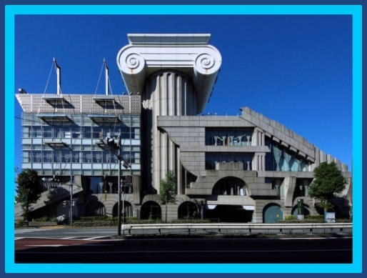 El edificio M2 es un ejemplo de collage de estilos y de escalas que centra su eje de atención en una gigantesca columna jónica sobre arcos, realizado en 1991 por Kengo Kuma & Associates, en Tokio Japón.