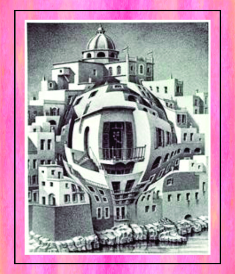 En 1945 Escher se enfrenta a las esferas y esto lo observamos en su obra Balcón, donde nos muestra lo que pasaría si de la superficie se inflara un elemento esférico y este aumentara de tamaño para mostrarnos su contenido.