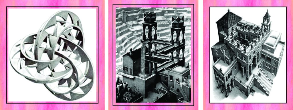 Tres ejemplos del infinito en la obra de Escher, en el primer ejemplo una figura geométrica entrelazada al estilo del triangulo de Penrose; segundo «Waterfull» donde un río desciende para luego subir indefinidamente, tercero «Ascending y descending» unos personajes suben y bajan escaleras por toda la eternidad.