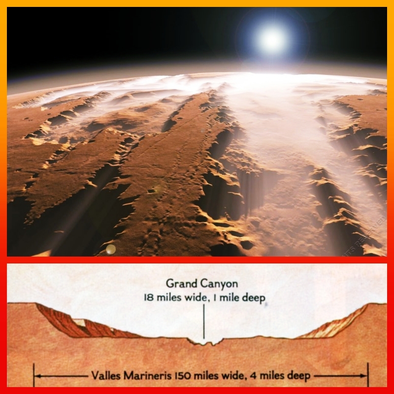 El ecuador del planeta está marcado por una gigantesca cicatriz geográfica que ni “Juan Charrasqueado, pistolero y jugador” presume de tipo rudo; es diez veces más larga, ancha y profunda que el Gran Cañón del Colorado; se trata de Valles Marineris una grieta de 4000 km de longitud, 200 km de ancho y 7 km de profundidad.