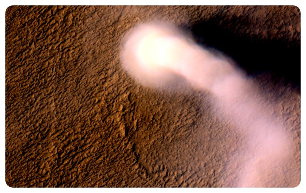 Cuando llega el verano, el radical cambio de temperatura producido por radiación solar sobre una muy delgada capa atmosférica, genera viento; aunado a esto una frágil oposición por su baja gravedad eleva fácilmente partículas de polvo que provocan neblina amarilla, que a veces cubre a todo el planeta y hasta puede durar meses. Lo que explica los cambios de coloración en Marte, que habían intrigado tanto a los astrónomos.