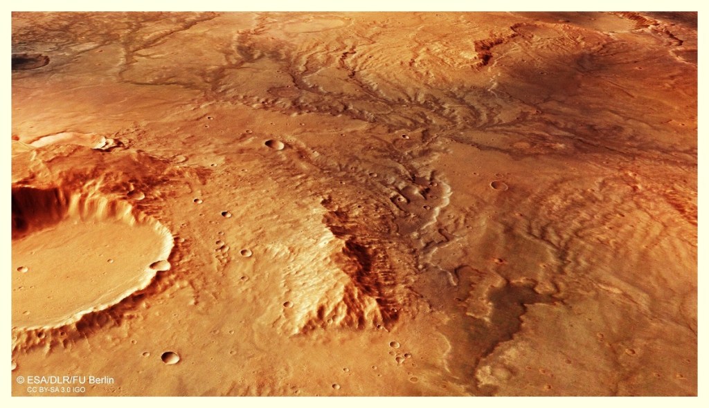 La topografía marciana está dividida en dos hemisferios radicalmente opuestos: Hacia el norte hay extendidas llanuras muy lisas, mientras que al sur la zona es muy accidentada con largas cordilleras y cientos de miles de cráteres.