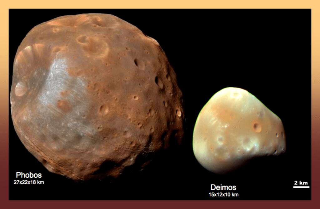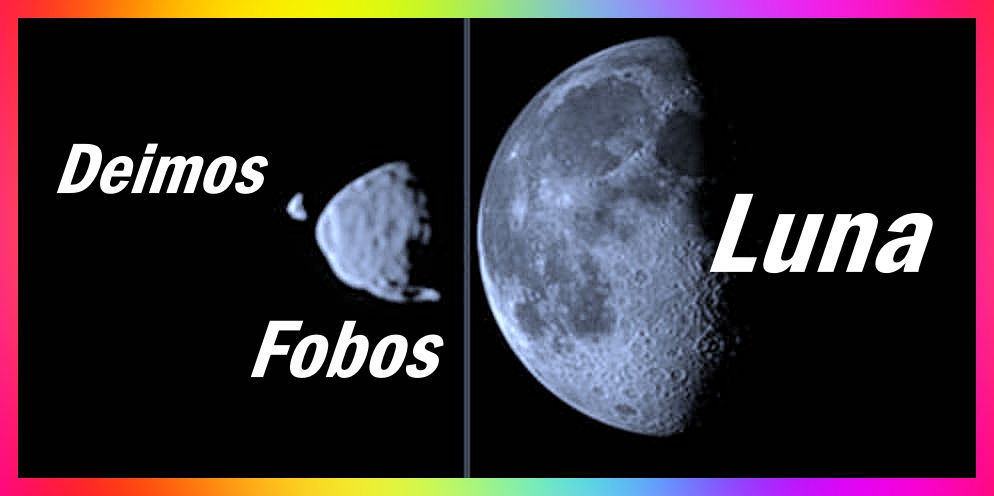 Son muy diferentes de nuestra bella Luna, tienen forma irregular como dos papas (o patatas) mal cultivadas y son muy pequeños en comparación; Fobos mide 22 km de diámetro y Deimos sólo unos 12 km, mientras que la Luna terrestre es de 3,474.2 km de diámetro.