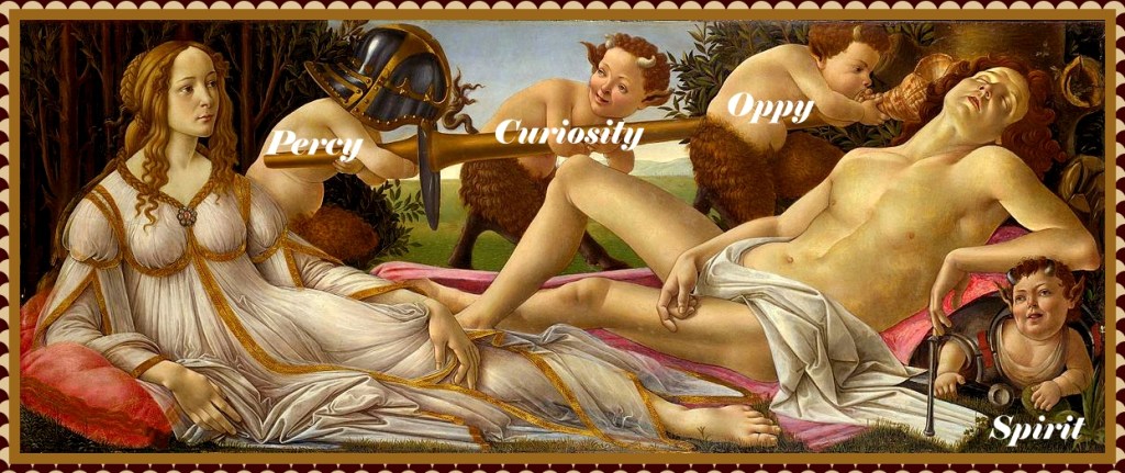 En esta simpática escena de arte renacentista, vemos a la hermosa diosa Venus vestida y bien acicalada después de un encuentro amoroso con Marte aún desnudo, tomando una siesta a plenitud y desenfado mientras los pequeños vástagos de Baco dios del vino, le hacen travesuras sin que este se percate si quiera. A esos pilluelos bien podríamos renombrarlos como: Opportunity, Spirit, Curiosity y Perseverance.