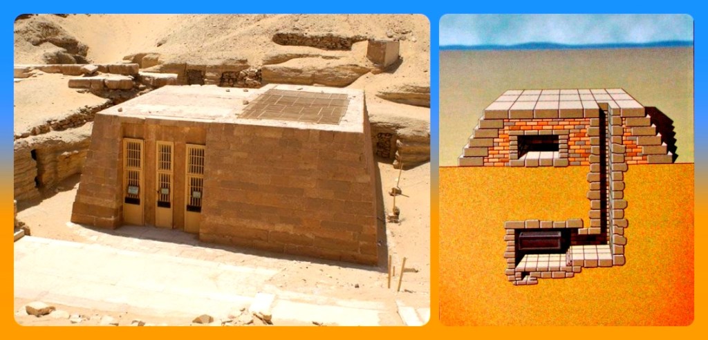 La MASTABA (anterior a la pirámide) es una tumba de forma trapezoidal con un hueco en el centro a modo de pozo, que traspasa la línea del suelo y conduce a un estrecho pasadizo subterráneo, hasta una cámara donde se depositaba el sarcófago. La mastaba recreaba una simulación de casa habitación para la eternidad. (3200 a 2700 a.C. Durante las primeras dinastías).