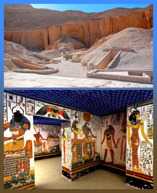 En tanto el HIPOGEO (posterior a la pirámide) es una galería de arte subterránea excavada en una montaña, con varias cámaras mortuorias y pasillos que, albergaban a las momias de la nobleza dentro de sarcófagos, junto a sus posesiones más valiosas para su comodidad en la Duat; es decir el más allá.