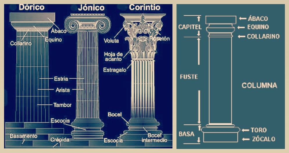 Los tres elementos principales de una columna de abajo hacia arriba son: la basa, el fuste y el capitel.