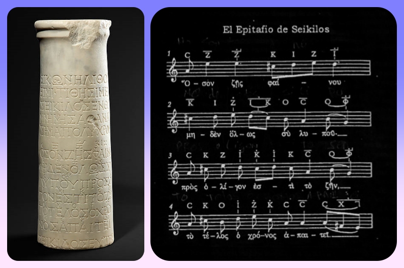 Pero es en Aydin, Turquía en lo que fue la antigua ciudad helenística de Trales, donde ¡Al fin se halló una canción completa en su texto y anotación musical!; se trata de un epitafio inscrito sobre una pequeña columna a modo de estela, que un hombre llamado Seikilos construyó para su esposa Euterpe, con un bello mensaje que data del siglo II de nuestra era.