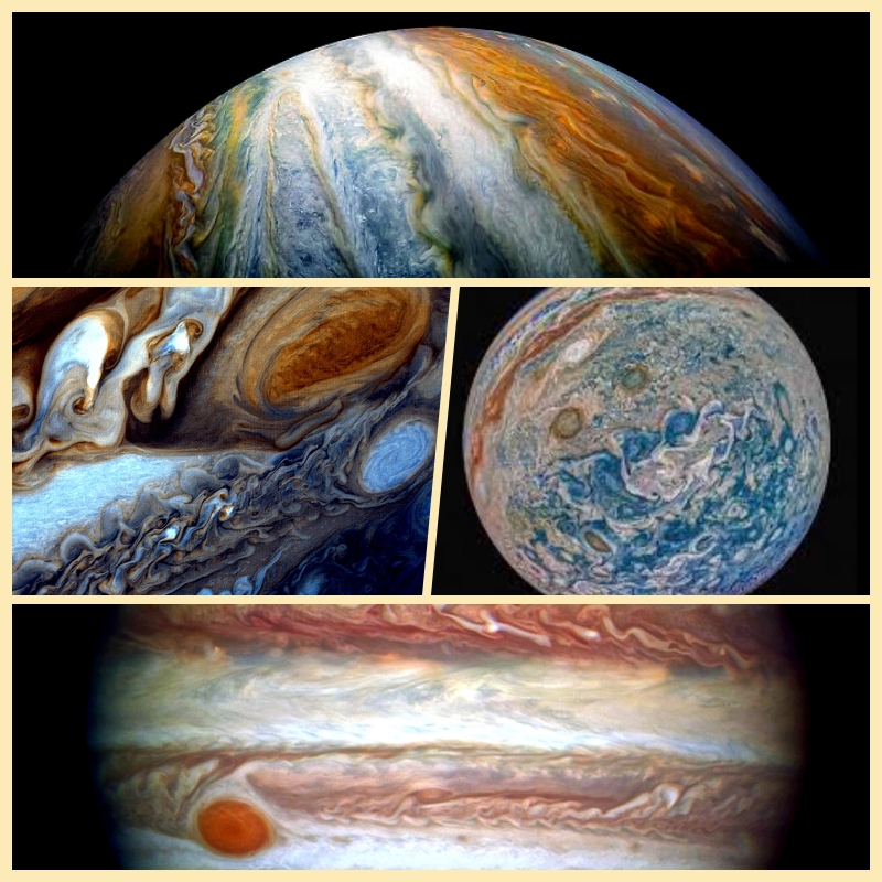 Júpiter tiene un aspecto peculiar con que se le identifica de inmediato; luce con gran estilo, cual modelo en pasarela ante las cámaras de los exploradores, los “cinturones” o franjas de nubes arremolinadas paralelas al ecuador. Y cómo pasar desapercibida su turbulenta mancha roja ovalada; revelada a detalle en las misiones de las naves como las sondas Voyager lanzadas en 1977; o el Telescopio Espacial Hubble; la Sonda Galileo que lo orbitó de 1995 hasta 2003; o también la Sonda Juno que fue lanzada en 2011, la cual nos proporcionó fotografías en alta resolución.