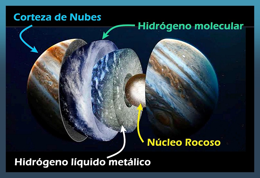 Júpiter es un planeta que desafía nuestra comprensión de lo que significa ser «grande». Sus dimensiones son tan asombrosas que podríamos fácilmente perder hasta 1321 Tierras dentro de su abrumadora inmensidad. Pero es poco denso, su composición es principalmente de hidrógeno en casi un 90 %, lo que resta es helio y otros elementos, por eso carece de una superficie sólida; sin embargo, tampoco es del todo una gran esfera esponjosa de gas, se cree que su núcleo es rocoso.