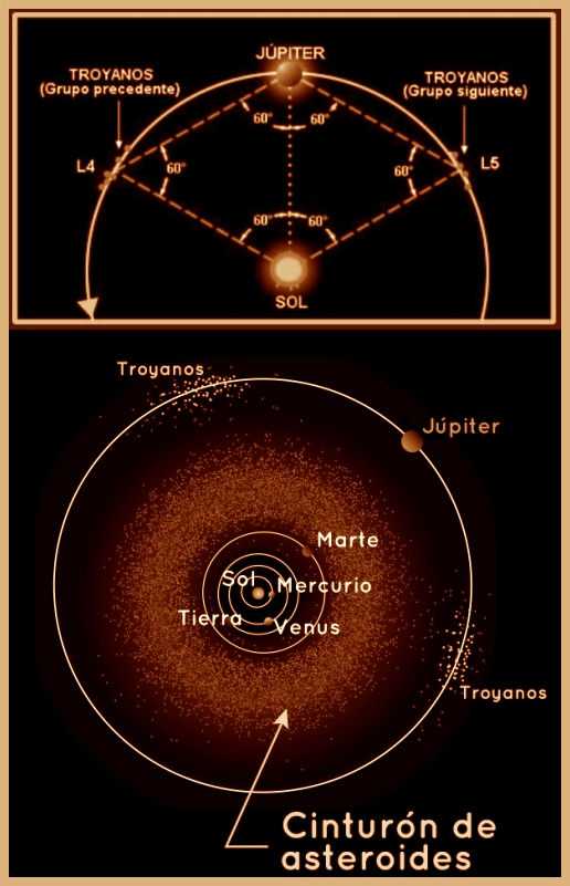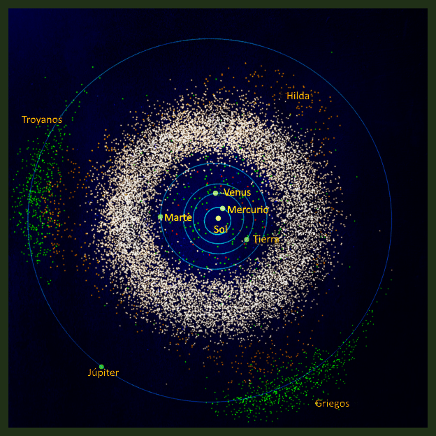 Troyanos: siguen a los planetas como pequeñas mascotas, compartiendo la misma orbita en armonía sin riesgo de colisión, ubicados en los llamados puntos Lagrange L4 y L5 que mantienen el equilibrio entre la gravedad del sol y la del planeta, siendo Júpiter el campeón con miles de troyanos, Neptuno con 28, Marte con 9 y la Tierra con 2: el 2010TK7 de 300 metros y el 2020XL5 de un kilómetro de diámetro, pero son muy difíciles de ver por el punto de vista desfavorable, tal vez tenga otros.