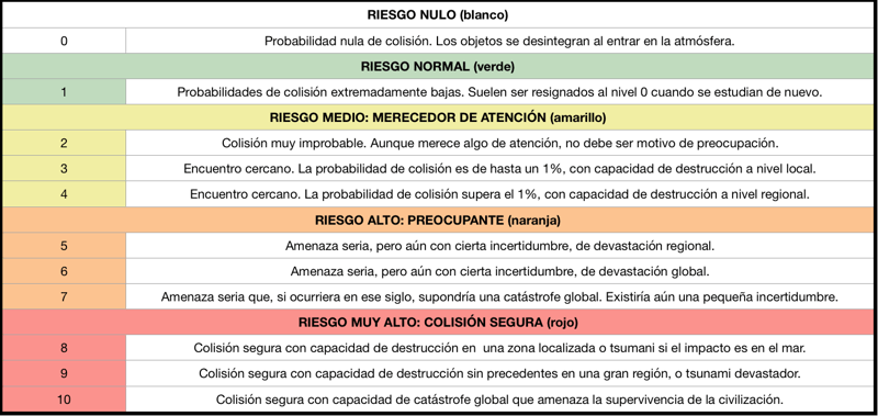 Para clasificar la peligrosidad de estos objetos (que también incluye cometas), se ha establecido la Escala de Turín, que determina mediante un sistema de niveles de colores el rango de probabilidad de colisión; y de números del 0 al 10, indicadores de la intensidad del daño potencial que podría causar en función de su tamaño y la energía cinética que conllevaría el impacto.