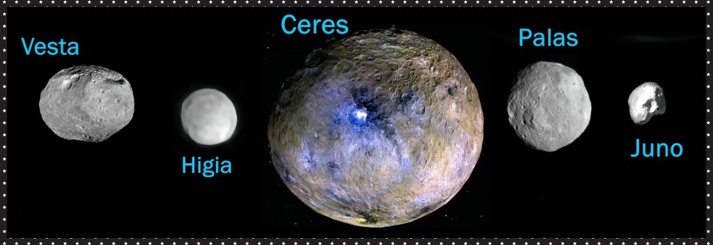 Las rocas más grandes observadas del Cinturón de Asteroides se nombraron como diosas grecorromanas y son: Ceres, Palas, Vesta, Higia y Juno.